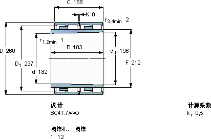 | 圆柱滚子轴承, 四列, BC4T.7, 圆锥型内孔, 延长内圈宽度 | |||||||||