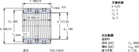 | 圆锥滚子轴承, 四列,TQO结构, TQO.1/GWI, 轴承孔中的螺旋槽 | |||||||||