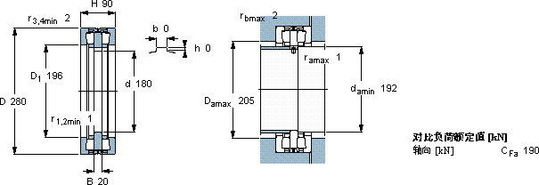 | 主要数据尺寸 | 基本负荷额定值 | 疲劳负荷限值 | 最小负荷系数 | 型号 | ||||