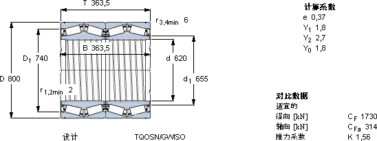 | 圆锥滚子轴承, 四列,TQO结构, TQOSN/GWISO, 轴承孔中的螺旋槽 | |||||||||