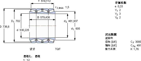 | 圆锥滚子轴承, 四列,TQI结构, TQIT, 圆锥型内孔 | |||||||||