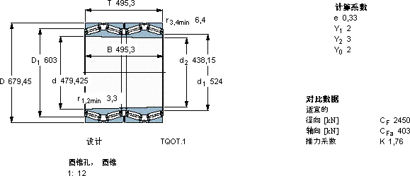 | 圆锥滚子轴承, 四列,TQO结构, TQOT.1, 圆锥型内孔 | |||||||||