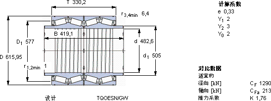 | 圆锥滚子轴承, 四列,TQO结构, TQOESN/GW, 轴承孔中的螺旋槽 | |||||||||