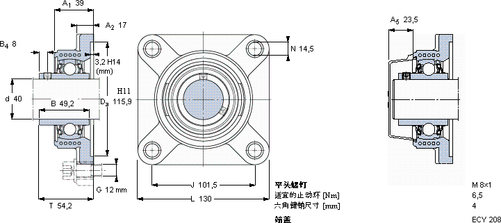 | Y-型轴承带法兰单元, Y-技术,方轴承座,平头螺钉锁定 | ||||||||||||