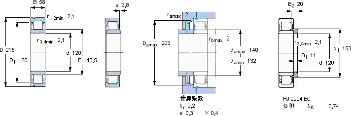 | 120 | 215 | 58 | 520 | 630 | 72 | 3400 | 5600 | 9,70 | NU 2224 ECNML * | HJ 2224 EC | ||