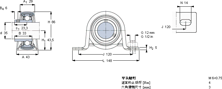 | Y-型立式轴承座单元, 冲压钢轴承座,平头螺钉锁定, 公制轴承 | |||||||||||||