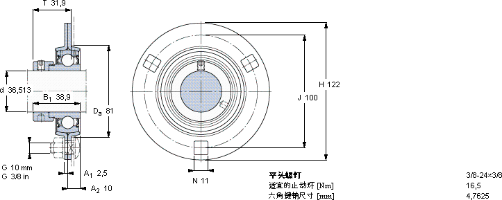 | Y-型轴承带法兰单元, 冲压钢轴承座,偏心锁定轴环 | ||||||||||||