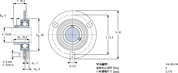 | Y-型轴承带法兰单元, 冲压钢轴承座,平头螺钉锁定 | ||||||||||||