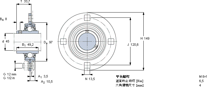 | Y-型轴承带法兰单元, 冲压钢轴承座,平头螺钉锁定, 带一个圆形法兰和三或四个螺栓孔, 公制轴承 | ||||||||||||