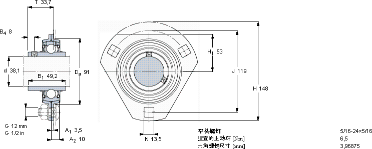 | Y-型轴承带法兰单元, 冲压钢轴承座,平头螺钉锁定 | ||||||||||||