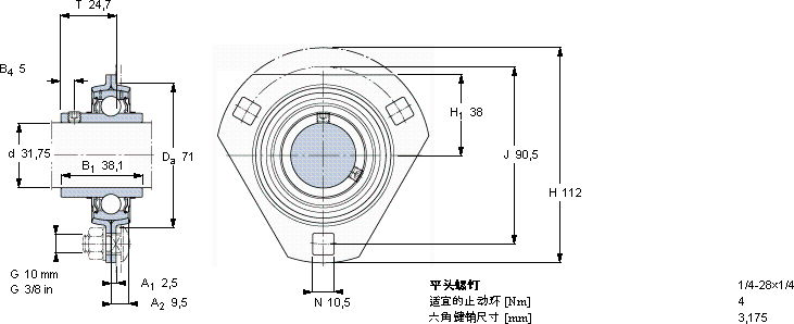 | Y-型轴承带法兰单元, 冲压钢轴承座,平头螺钉锁定 | ||||||||||||