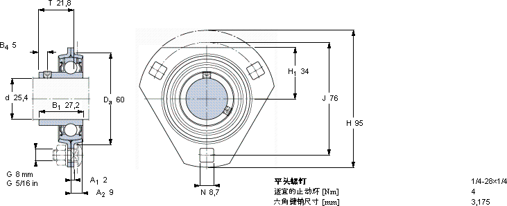 | Y-型轴承带法兰单元, 冲压钢轴承座,平头螺钉锁定 | ||||||||||||