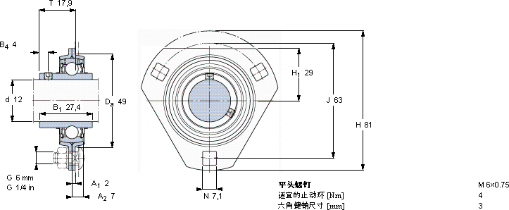 | Y-型轴承带法兰单元, 冲压钢轴承座,平头螺钉锁定, 带一个三角形法兰和三个螺栓孔, 公制轴承 | ||||||||||||