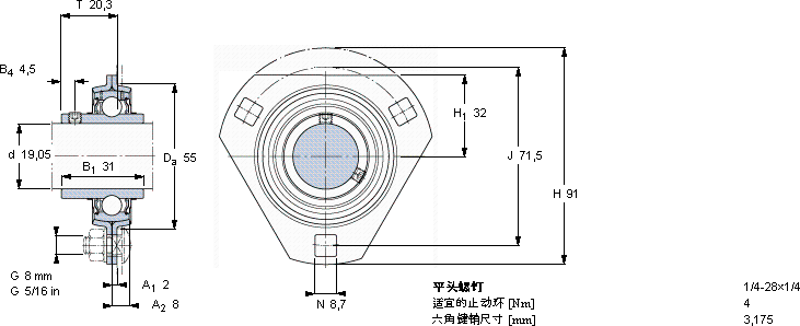 | Y-型轴承带法兰单元, 冲压钢轴承座,平头螺钉锁定 | ||||||||||||