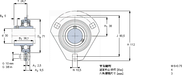Y-型轴承带法兰单元, 冲压钢轴承座,平头螺钉锁定, 带一个三角形法兰和三个螺栓孔, 公制轴承