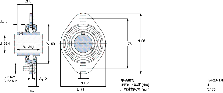 | Y-型轴承带法兰单元, 冲压钢轴承座,平头螺钉锁定 | ||||||||||||