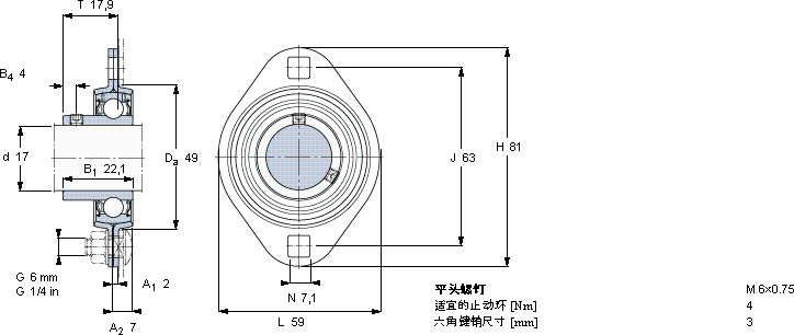 | Y-型轴承带法兰单元, 冲压钢轴承座,平头螺钉锁定, 带一个椭圆形法兰和两个螺栓孔, 公制轴承 | ||||||||||||