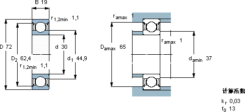 | 30 | 72 | 19 | 22,5 | 14,6 | 0,64 | 20000 | 11000 | 0,35 | W 6306-2Z | |