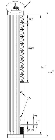 1)L2 = 总行程 x 1.18 + L + 25Ltot = 总行程 x 1.18 + L + 86总行程= 有效行程 + 2 x S(mm)注意:允差 S 标示了适用于特殊应用的安全范围值且该数值至少与主轴节距尺寸相当Pz;总行程单位为 mm。支撑导轨的最大长度为 L2 = 5300 mm。 全行程长度超过 1200 mm 的执行器能;与可移动的主轴支撑配合 (后缀为 SPU 或 2SPU)。