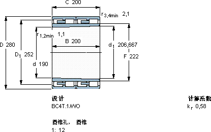 | 圆柱滚子轴承, 四列, BC4T.1, 圆锥型内孔 | |||||||||