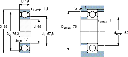 | 45 | 85 | 19 | 21,6 | 180 | 292 | 0,41 | 6209-2Z/VA201 | |