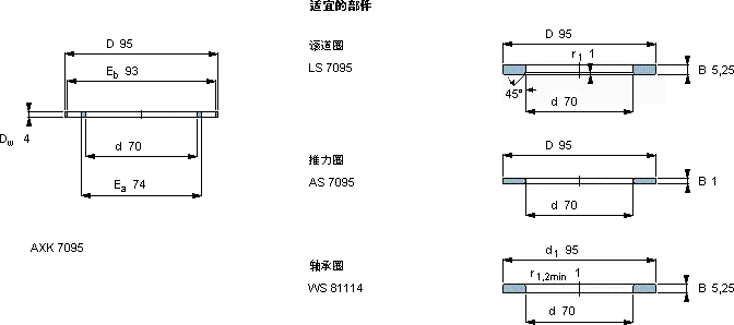 AXK 7095轴承是【SKF轴承 > 滚动轴承 > 滚针推力轴承】的型号,主要用在燃汽轮机、各类变速器、减速装置、铁路车辆、轧钢机齿轮箱座、机床主轴、电机厂、塑料、挖掘机、抓钢机等各大领域。