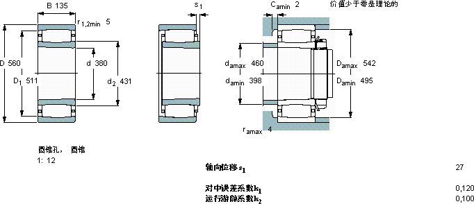 | CARB圆环滚子轴承, 圆柱和圆锥孔, 圆锥型内孔, 与保持架 | |||||||||||