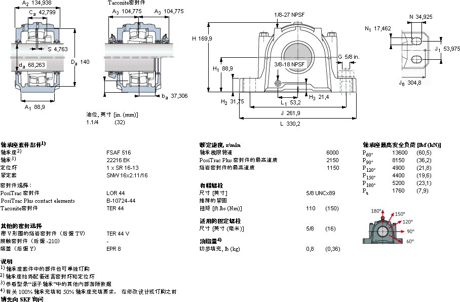 | 型号 | 基本负荷额定值, | 主要数据尺寸 | 迷宫密封件 | PosiTrac 密封件 | PosiTrac Plus密封件 | Taconite密封件 | |||||