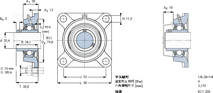 | Y-型轴承带法兰单元, 方形铸造轴承座,平头螺钉锁定, 英制轴承 | ||||||||||||