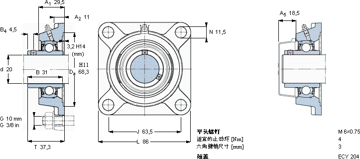 | Y-型轴承带法兰单元, 方形铸造轴承座,平头螺钉锁定, 公制轴承 | ||||||||||||