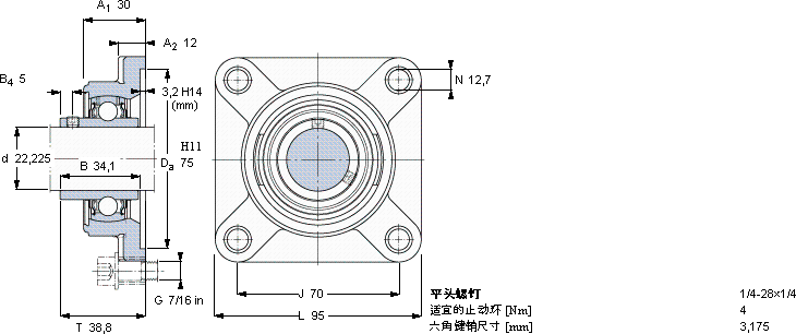 | Y-型轴承带法兰单元, 铸造轴承座 ,方形法兰,平头螺钉锁定,可用于空气调节系统 | ||||||||||||