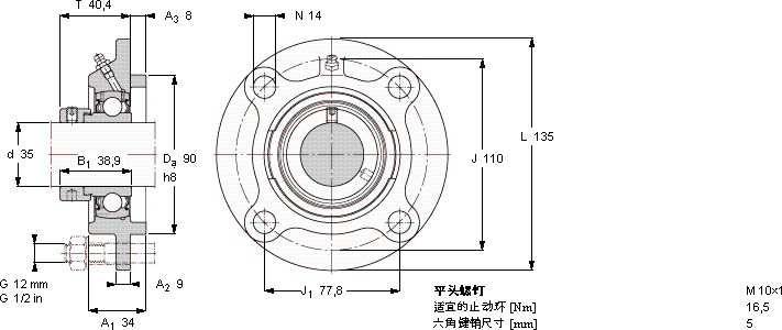 | Y-型轴承带法兰单元, 圆形铸造轴承座,偏心锁定轴环 | ||||||||||||