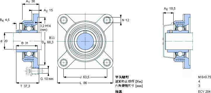 | Y-型轴承带法兰单元, Y-技术,方轴承座,平头螺钉锁定 | ||||||||||||