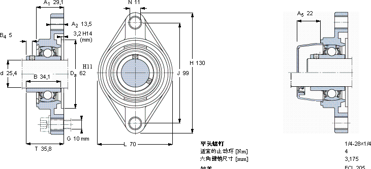 | Y-型轴承带法兰单元, 聚酯轴承座,椭圆形法兰,平头螺钉锁定,可用于食品行业的滑脂, 英制轴承 | ||||||||||||