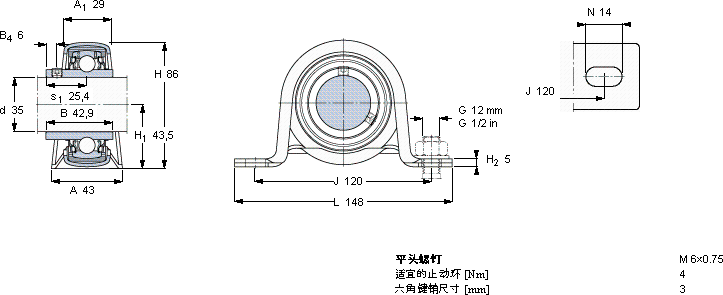 | Y-型立式轴承座单元, 冲压钢轴承座,平头螺钉锁定, 公制轴承 | |||||||||||||