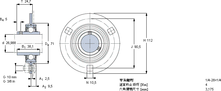 | Y-型轴承带法兰单元, 冲压钢轴承座,平头螺钉锁定 | ||||||||||||