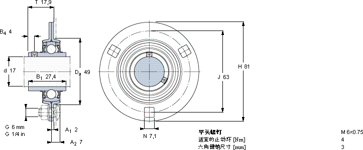 Y-型轴承带法兰单元, 冲压钢轴承座,平头螺钉锁定, 带一个圆形法兰和三或四个螺栓孔, 公制轴承