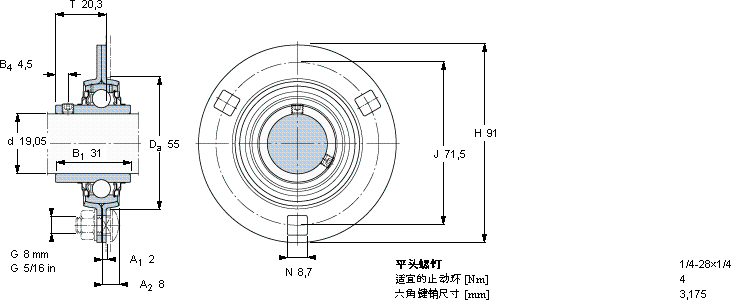 Y-型轴承带法兰单元, 冲压钢轴承座,平头螺钉锁定