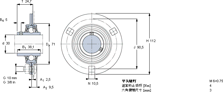 | Y-型轴承带法兰单元, 冲压钢轴承座,平头螺钉锁定, 带一个圆形法兰和三或四个螺栓孔, 公制轴承 | ||||||||||||