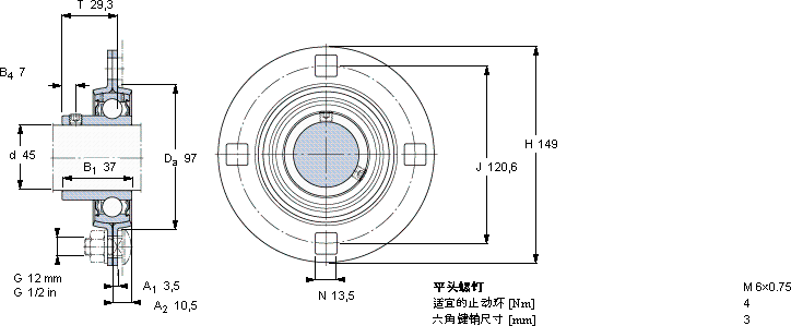 | Y-型轴承带法兰单元, 冲压钢轴承座,平头螺钉锁定, 带一个圆形法兰和三或四个螺栓孔, 公制轴承 | ||||||||||||