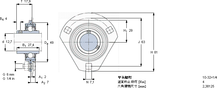 | Y-型轴承带法兰单元, 冲压钢轴承座,平头螺钉锁定 | ||||||||||||