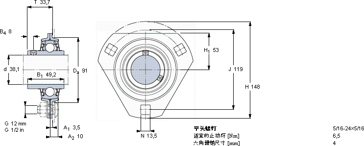 | Y-型轴承带法兰单元, 冲压钢轴承座,平头螺钉锁定 | ||||||||||||