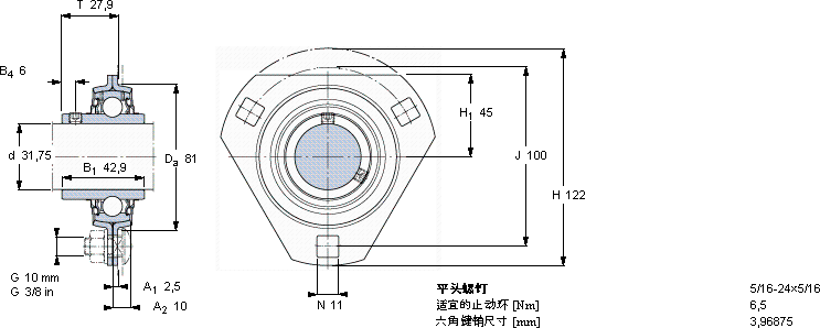 | Y-型轴承带法兰单元, 冲压钢轴承座,平头螺钉锁定 | ||||||||||||