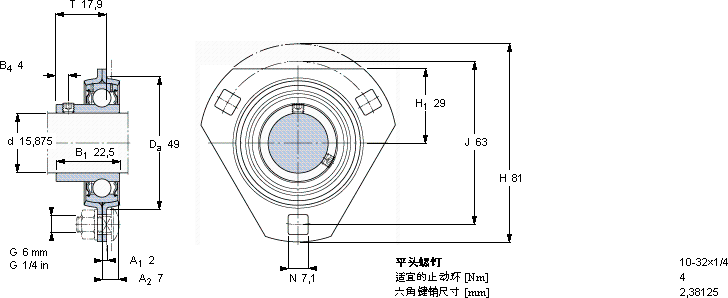 | Y-型轴承带法兰单元, 冲压钢轴承座,平头螺钉锁定 | ||||||||||||