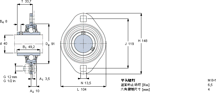 Y-型轴承带法兰单元, 冲压钢轴承座,平头螺钉锁定, 带一个椭圆形法兰和两个螺栓孔, 公制轴承