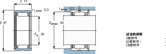 | 滚针轴承, 带法兰,无内圈, 单面密封件 | ||||||||||